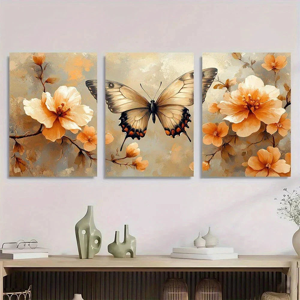 3pcs Beige Floral and Butterfly Serene Nature Metal Print Ready to Hang Art