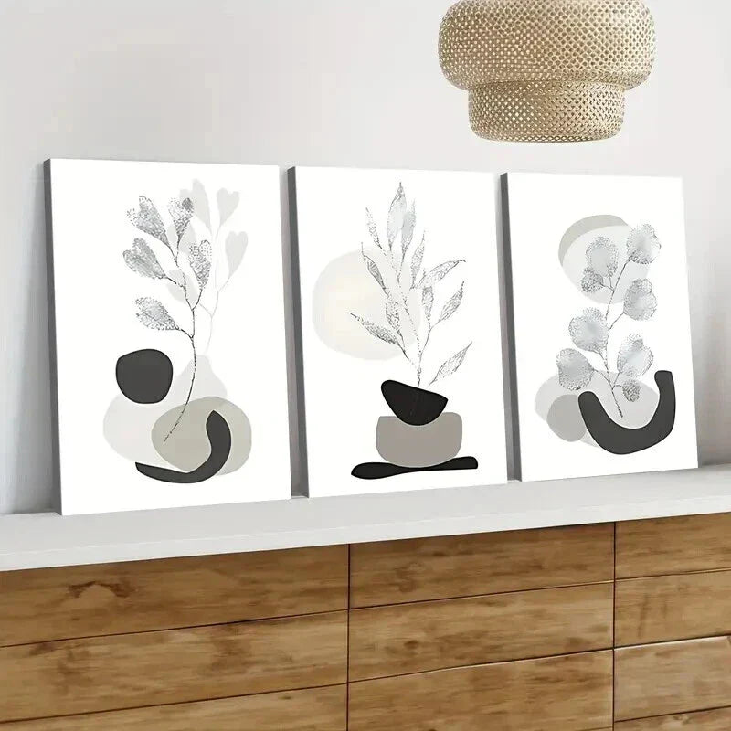 3pcs Beige Gray Liner Florals Leaves Black Stone Wall Art Set Canvas Framed 40x60cm - High Quality Print 100% Australian Made Wall Canvas Ready to Hang
