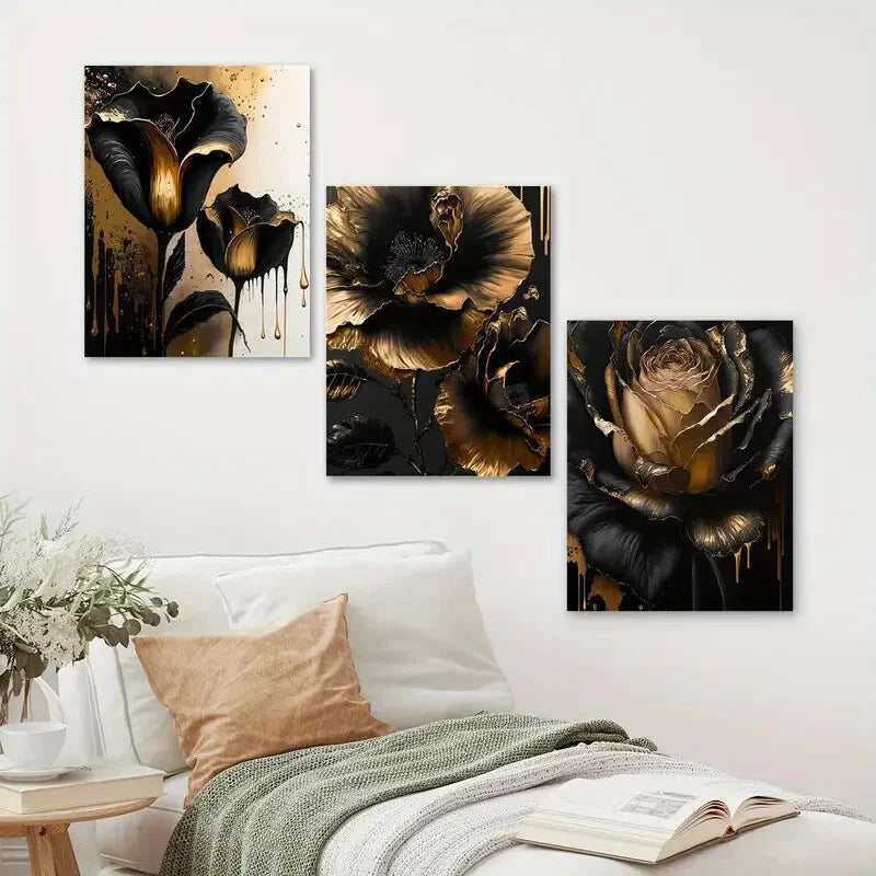3pcs Black And Golden Hibiscus, Daisies, And Roses Metal Print Ready to Hang Art