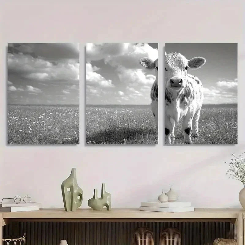 3pcs Black and White Country Style Cow Metal Print Ready to Hang Art