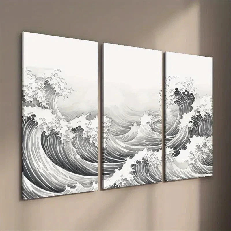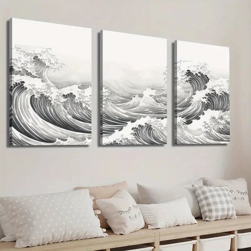 3pcs Black and White Japanese Ocean Wave Wall Art Set Canvas Framed 40x60cm - High Quality Print 100% Australian Made Wall Canvas Ready to Hang