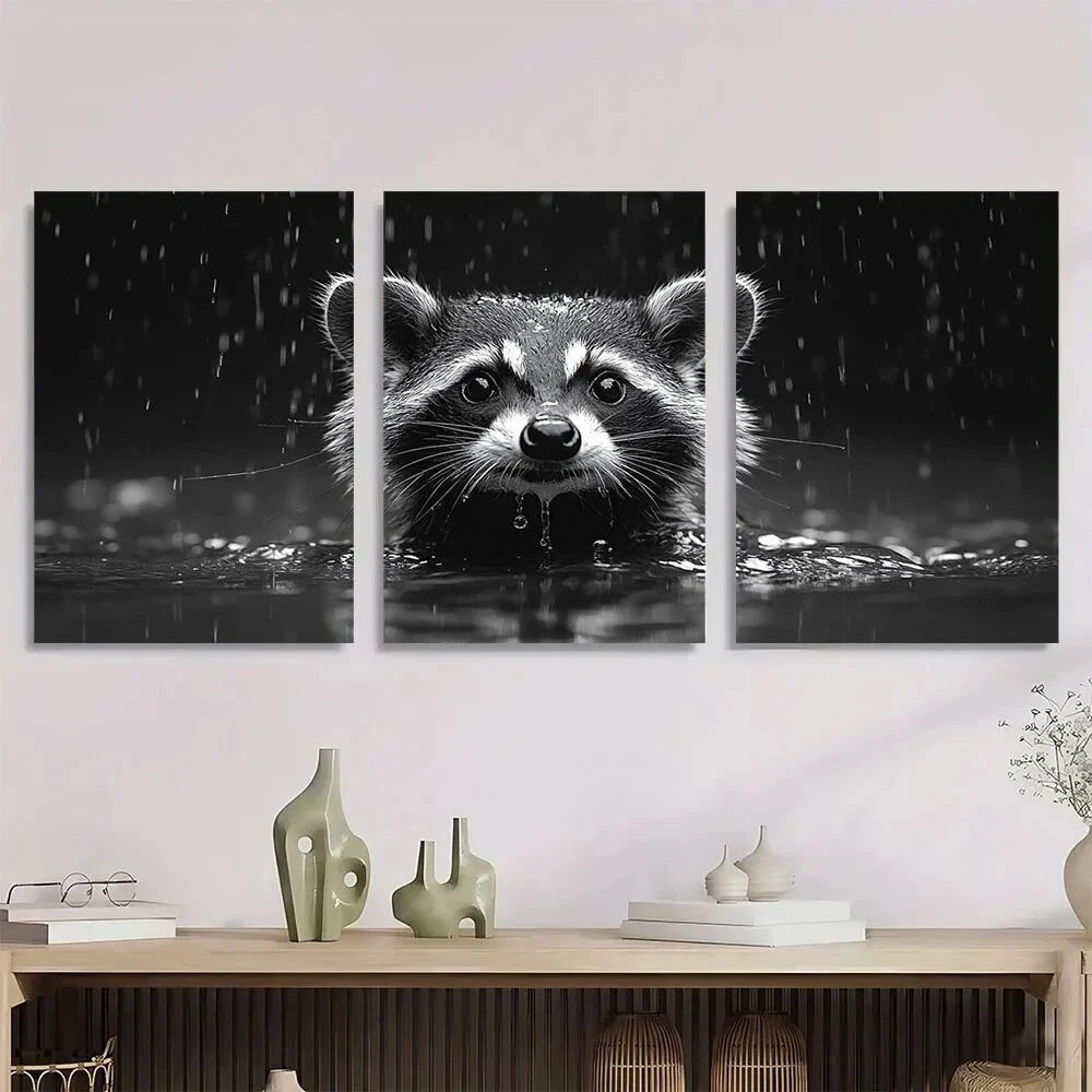 3pcs Black and White Raccoon Rainy Night Scene Metal Print Ready to Hang Art