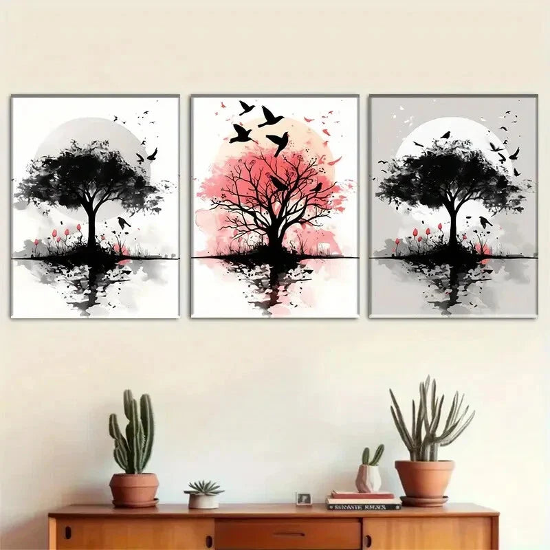 3pcs Black And White Tree Art with Pink Accents Metal Print Ready to Hang Art