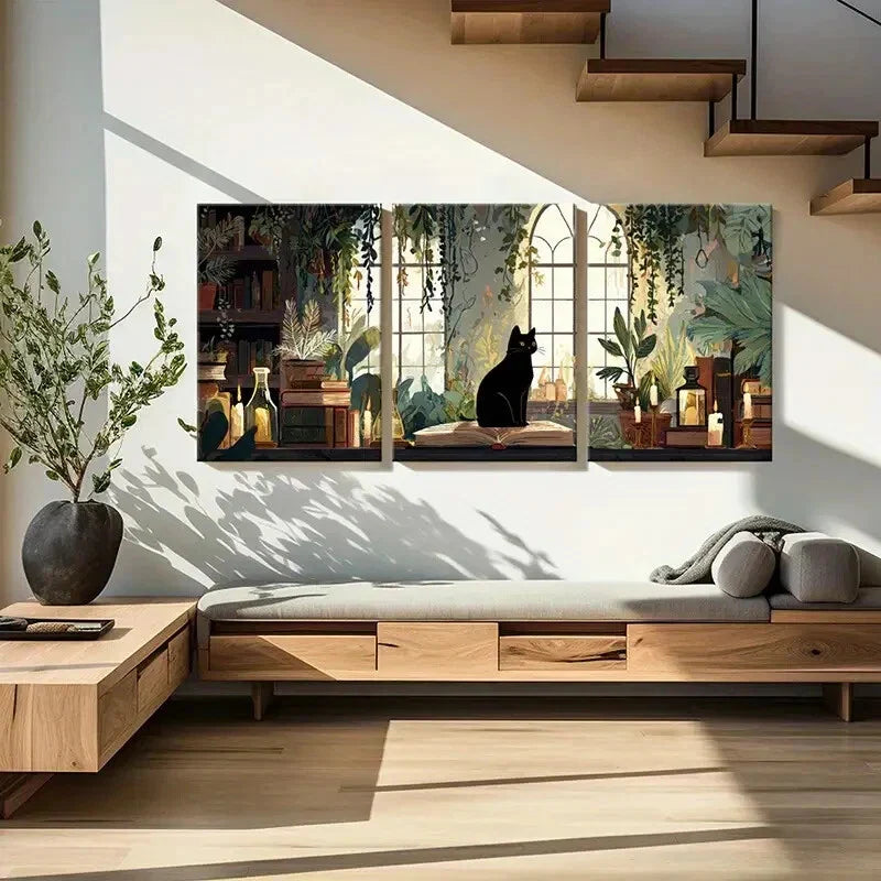 3pcs Black Cat Vintage Books Candles Green Plants Metal Print Ready to Hang Art