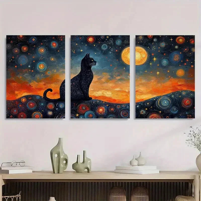 3pcs Black Cat with Celestial Patterns Metal Print Ready to Hang Art