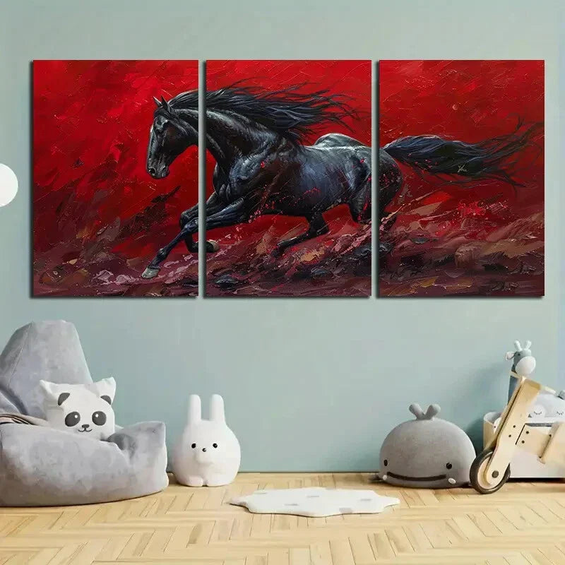 3pcs Black Horse Abstract Vivid Red and Black Metal Print Ready to Hang Art