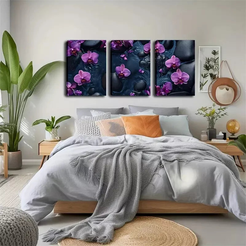 3pcs Black Pebbles & Purple Orchids Triptych Wall Art Set Canvas Framed 40x60cm - High Quality Print 100% Australian Made Wall Canvas Ready to Hang