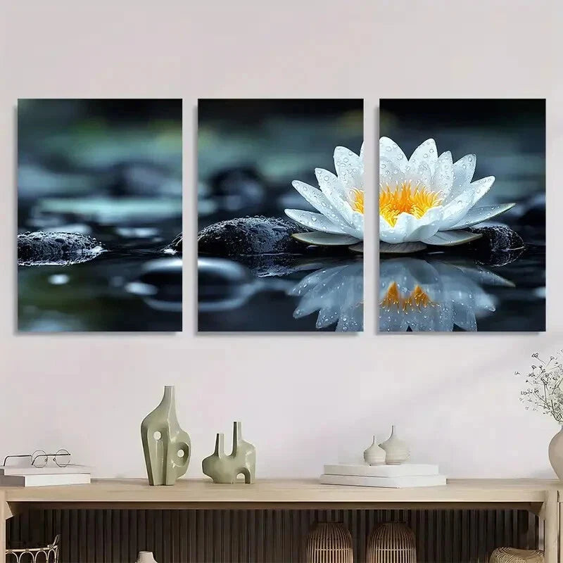 3pcs Black Stones & White for Lotus Metal Print Ready to Hang Art