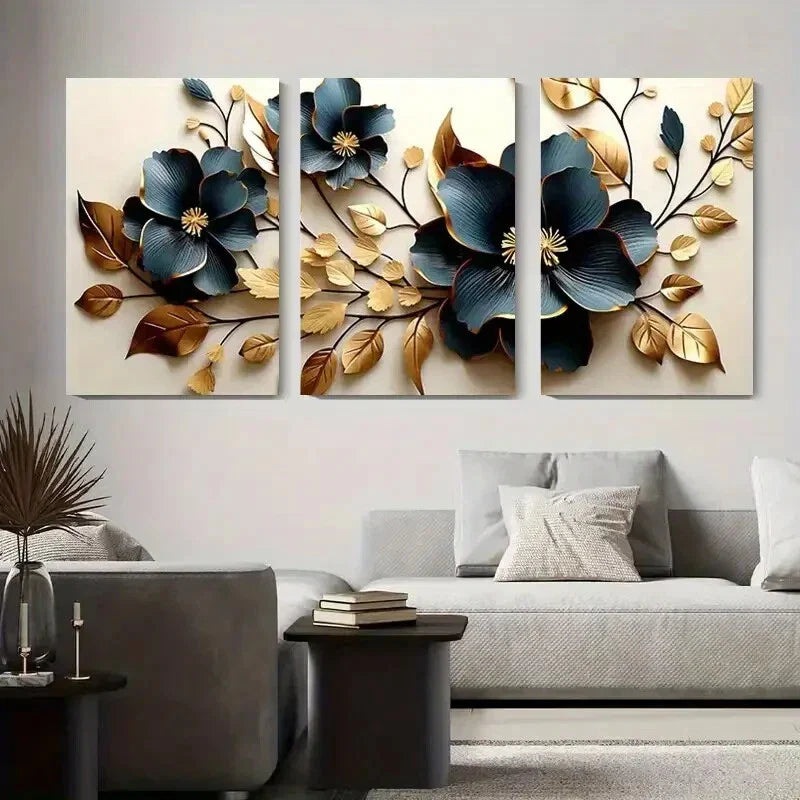 3pcs Blue and Golden Flower & Leaf Design Metal Print Ready to Hang Art