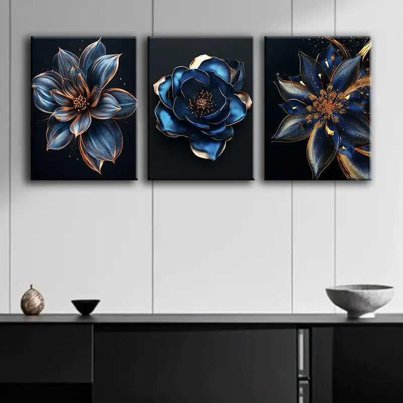 3pcs Blue And Golden Flower Metal Print Ready to Hang Art