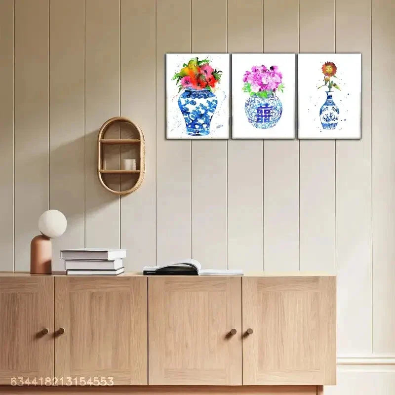 3pcs Blue and White Porcelain Floral Decoration Metal Print Ready to Hang Art