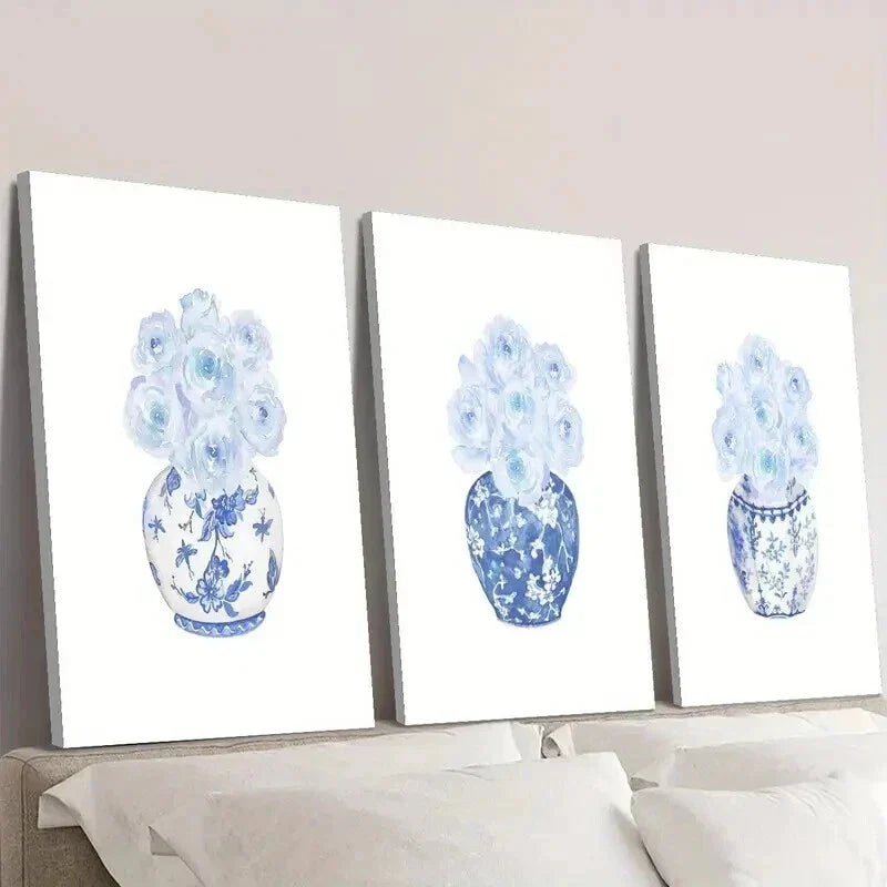 3pcs Blue and White Porcelain Rose Vase Wall Art Set Canvas Framed 40x60cm - High Quality Print 100% Australian Made Wall Canvas Ready to Hang