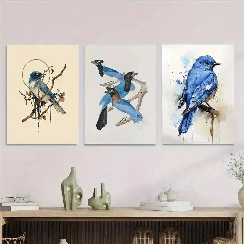 3pcs Blue Bird Watercolor Nature Bird Wall Art Set Canvas Framed 40x60cm - High Quality Print 100% Australian Made Wall Canvas Ready to Hang