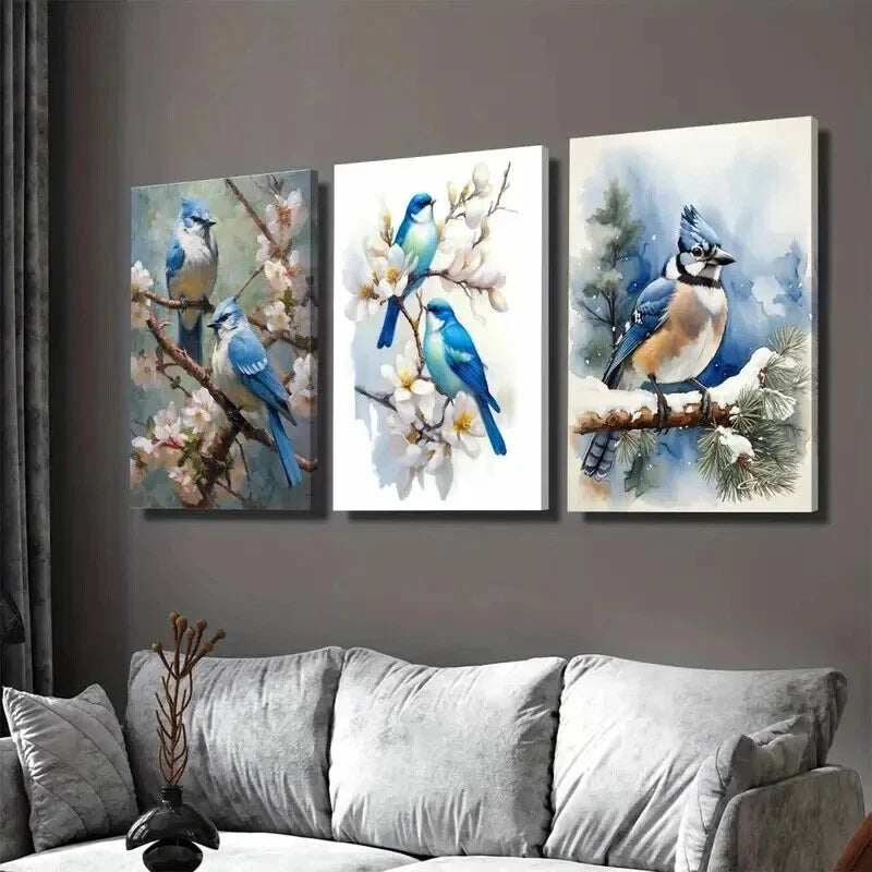 3pcs Blue Birds On Cherry Blossom Modern Classic Wall Art Set Canvas Framed 40x60cm - High Quality Print 100% Australian Made Wall Canvas Ready to Hang