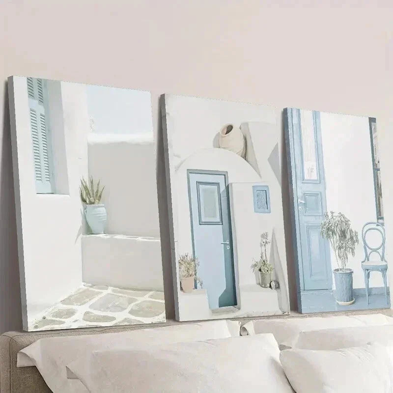 3pcs Blue Doors Porches White Walls & Potted Wall Art Set Canvas Framed 40x60cm - High Quality Print 100% Australian Made Wall Canvas Ready to Hang