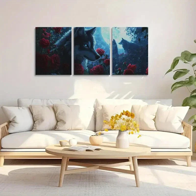3pcs Blue Eyed Wolf with Roses Dark Metal Print Ready to Hang Art