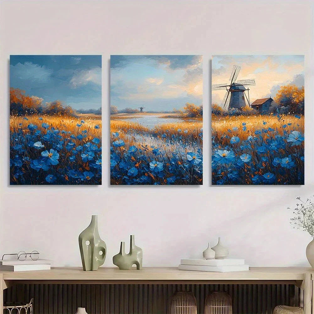 3pcs Blue Flowers & Rustic Windmill Metal Print Ready to Hang Art