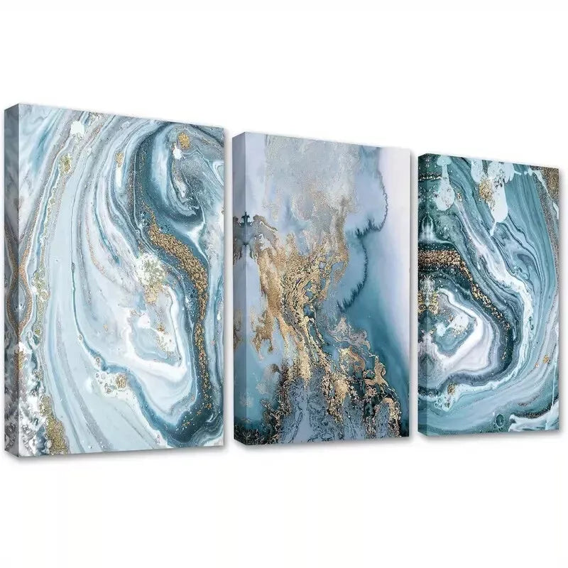 3pcs Blue & Golden Abstract Watercolor Wall Art Set Canvas Framed 40x60cm - High Quality Print 100% Australian Made Wall Canvas Ready to Hang