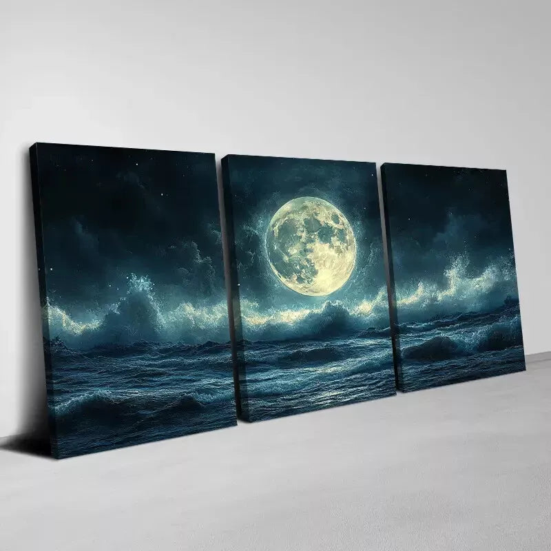3pcs Blue & Green Starry Night Sky Moonlit Ocean Wall Art Set Canvas Framed 40x60cm - High Quality Print 100% Australian Made Wall Canvas Ready to Hang