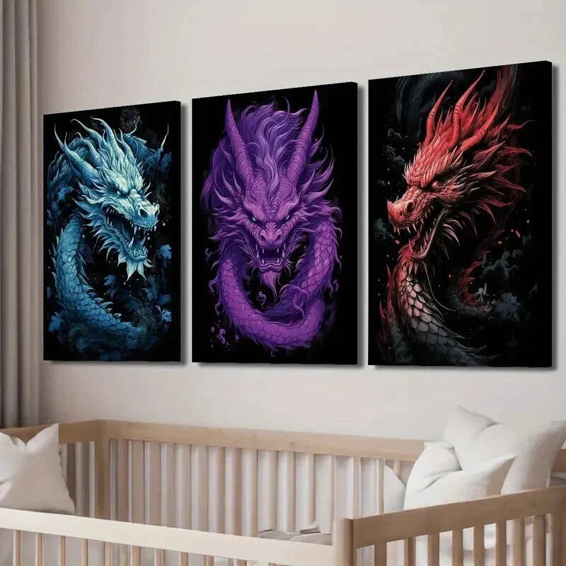 3pcs Blue Purple & Red Vibrant Dragons Wall Art Set Canvas Framed 40x60cm - High Quality Print 100% Australian Made Wall Canvas Ready to Hang