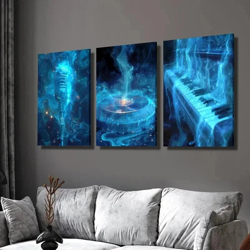 3pcs Blue Smokey Microphone Vinyl Record Piano Wall Art Set Canvas Framed 40x60cm - High Quality Print 100% Australian Made Wall Canvas Ready to Hang