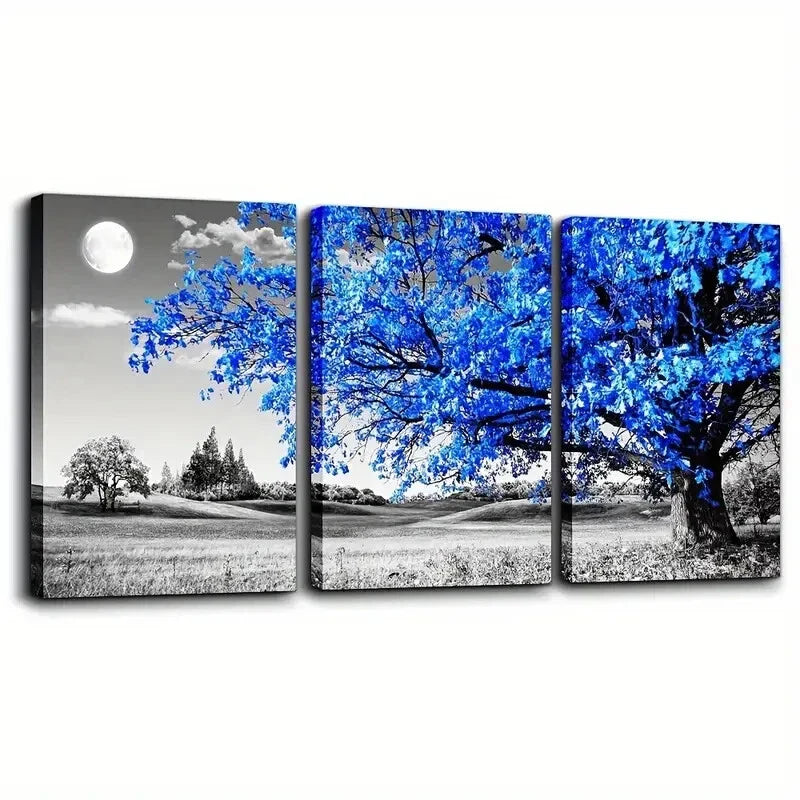 3pcs Blue Tree Moon Landscape with Vibrant Blue Hues Wall Art Set Canvas Framed 40x60cm - High Quality Print 100% Australian Made Wall Canvas Ready to Hang