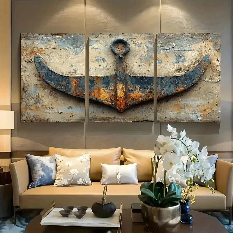3pcs Boat Anchor Laying On Beach Sand Design Metal Print Ready to Hang Art