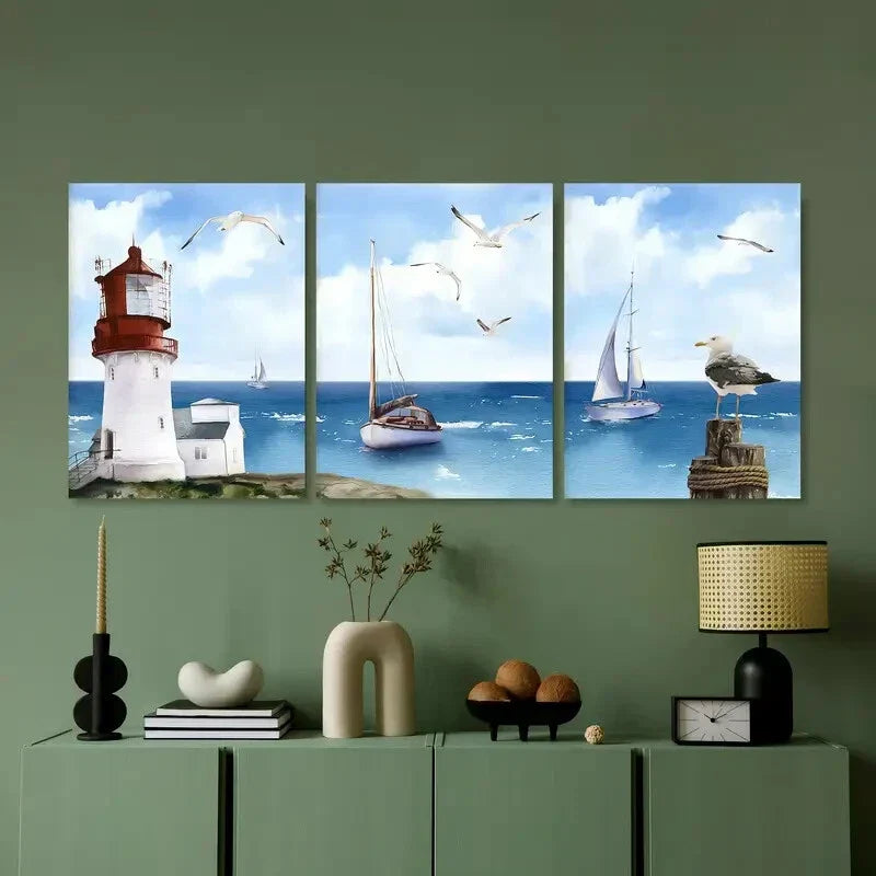 3pcs Boats On The Ocean Vintage Beach Lighthouse Metal Print Ready to Hang Art