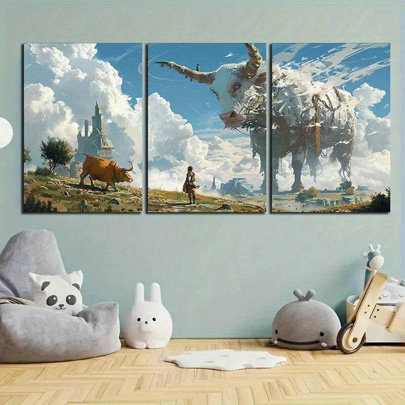 3pcs Brave Bull White Clouds Blue Sky Metal Print Ready to Hang Art