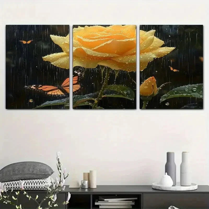 3pcs Butterfly And Rose Yellow Metal Print Ready to Hang Art