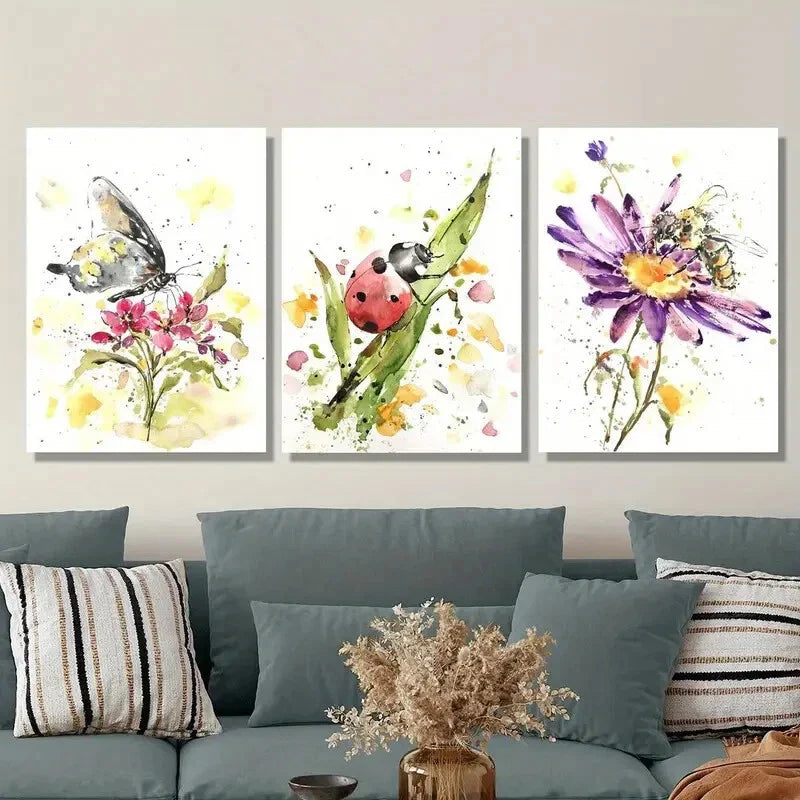 3pcs Butterfly, Ladybug & Bee Flowers & Insects Metal Print Ready to Hang Art