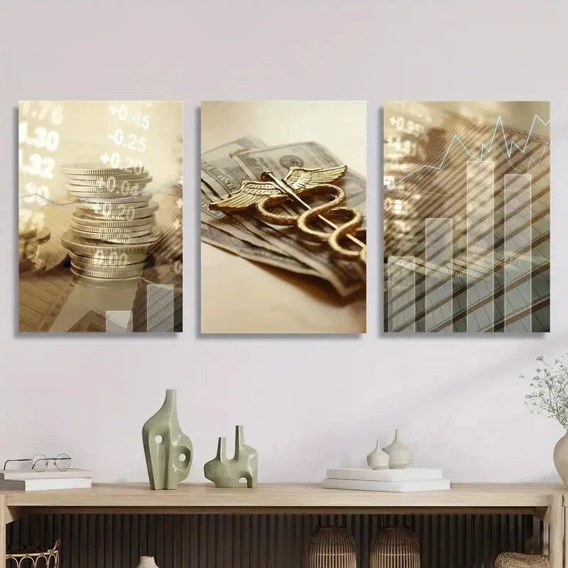 3pcs Caduceus Medical Symbol & Currency Metal Print Ready to Hang Art