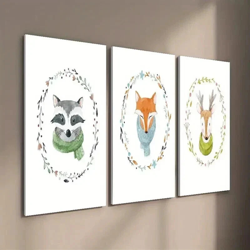 3pcs Cartoon Flower Crown Fox Deer Raccoon Wall Art Set Canvas Framed 40x60cm - High Quality Print 100% Australian Made Wall Canvas Ready to Hang