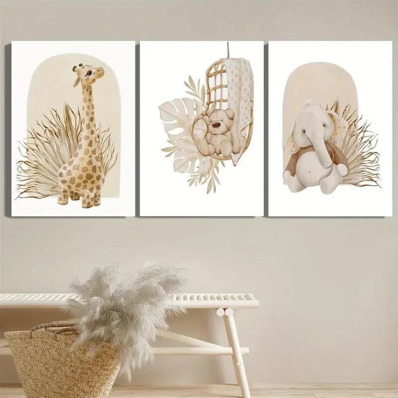 3pcs Cartoon Giraffe Bear Elephant Metal Print Ready to Hang Art