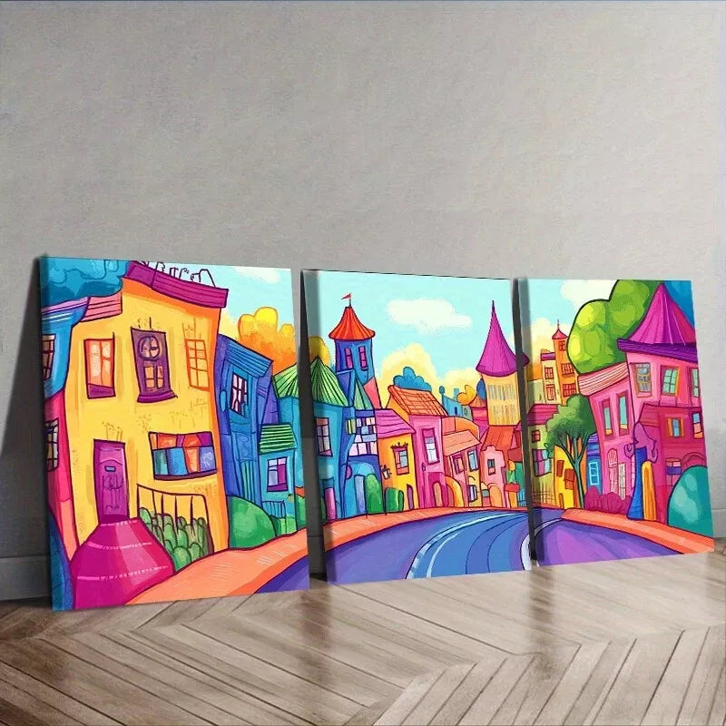 3pcs Cartoon Town Colorful Background Wall Art Set Canvas Framed 40x60cm - High Quality Print 100% Australian Made Wall Canvas Ready to Hang