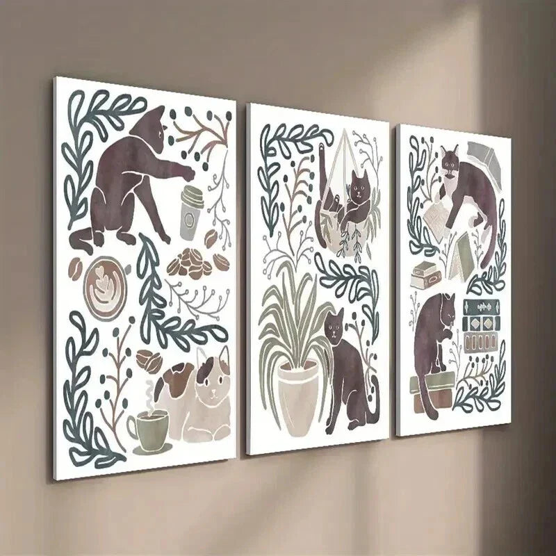 3pcs Cat Posters with Coffee & Indoor Scenes Wall Art Set Canvas Framed 40x60cm - High Quality Print 100% Australian Made Wall Canvas Ready to Hang