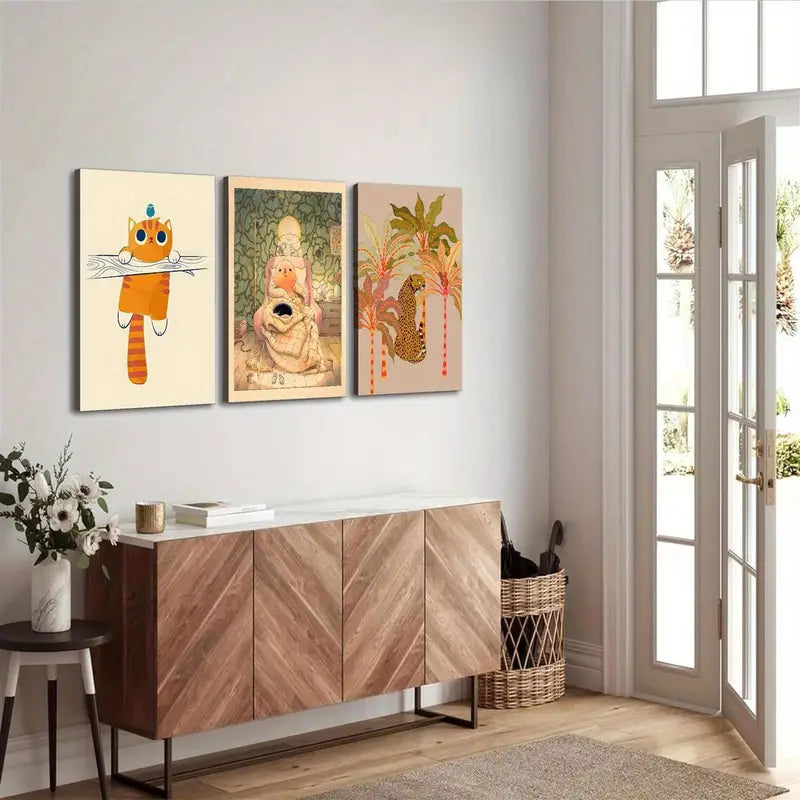 3pcs cat with a stick in its mouth, Stealthy of the Leopard Metal Print Ready to Hang Art