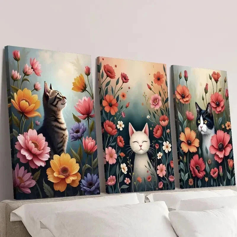 3pcs Cats in the Colorful Garden Design Wall Art Set Canvas Framed 40x60cm - High Quality Print 100% Australian Made Wall Canvas Ready to Hang
