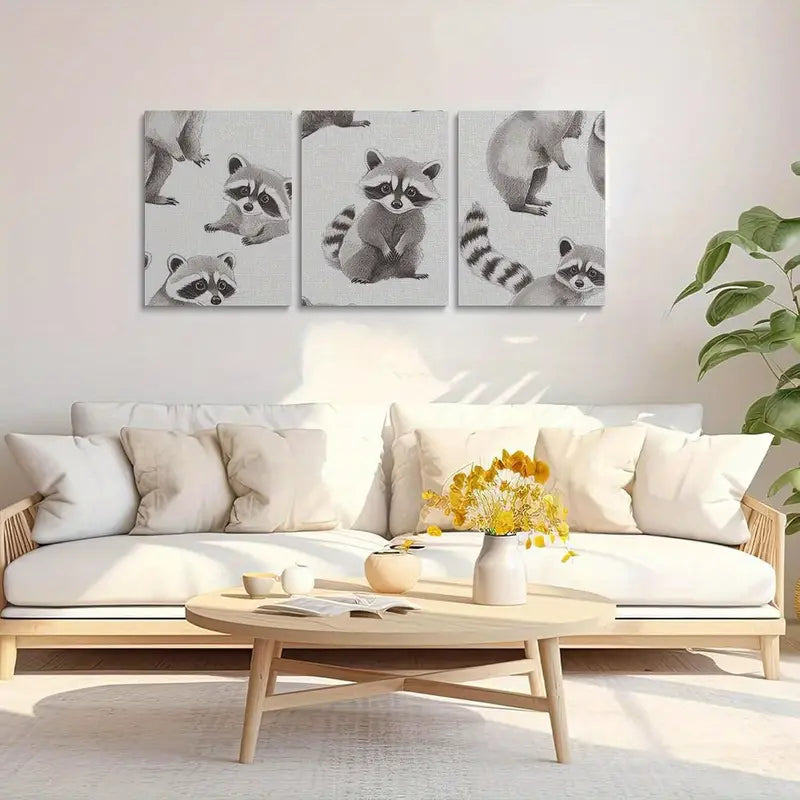 3pcs Charming Digital Illustration of Adorable Raccoons Metal Print Ready to Hang Art