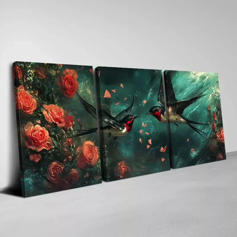 3pcs Charming Swallows Flying and Floral Roses Wall Art Set Canvas Framed 40x60cm - High Quality Print 100% Australian Made Wall Canvas Ready to Hang