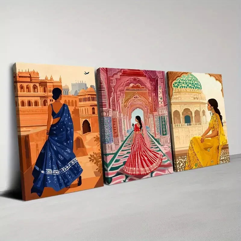 3pcs Charming Vintage Traditional Indian Women Wall Art Set Canvas Framed 40x60cm - High Quality Print 100% Australian Made Wall Canvas Ready to Hang