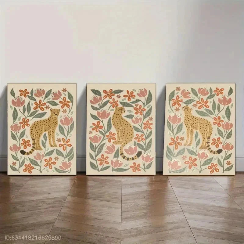 3pcs Cheetah & Floral Mid-Century Vintage Style Metal Print Ready to Hang Art