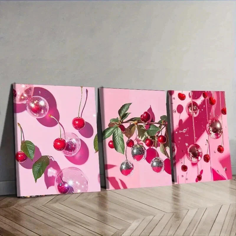 3pcs Cherry and Disco Ball Pink Colorful Sweet Wall Art Set Canvas Framed 40x60cm - High Quality Print 100% Australian Made Wall Canvas Ready to Hang