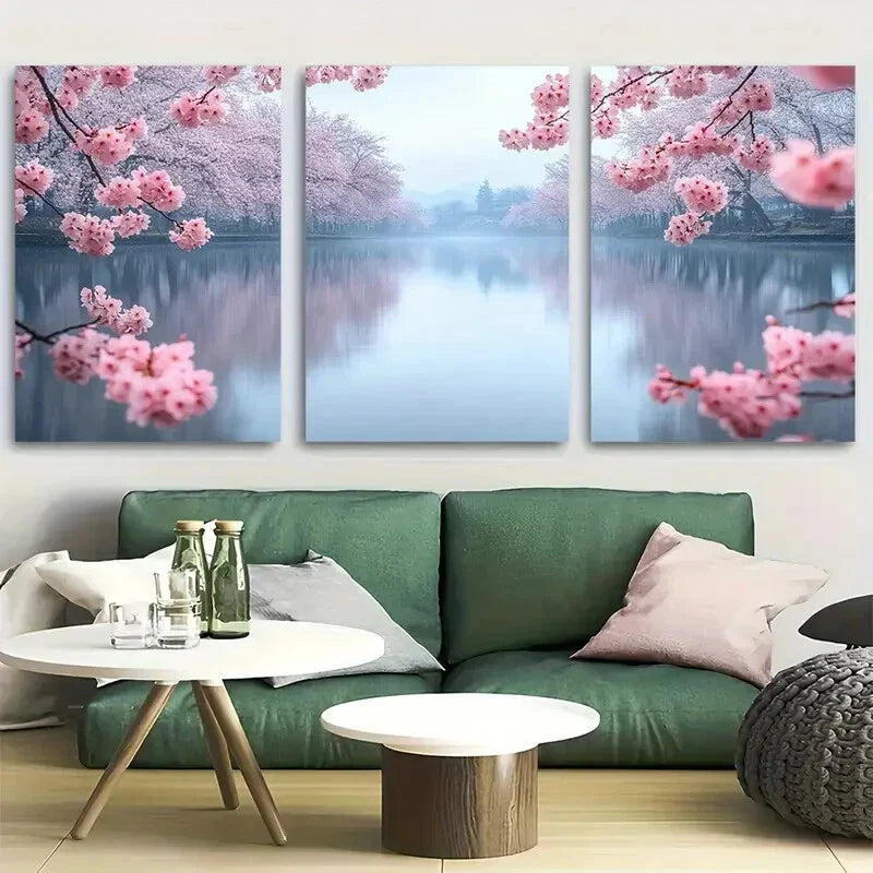 3pcs Cherry Blossom Trees and Tranquil Lake Design Metal Print Ready to Hang Art