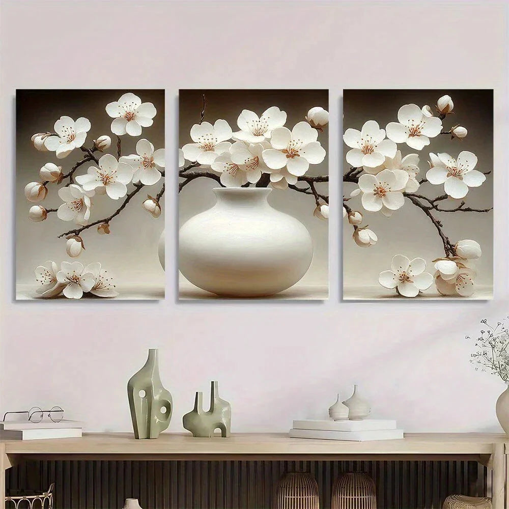 3pcs Cherry Blossom White Vase & Branches Metal Print Ready to Hang Art