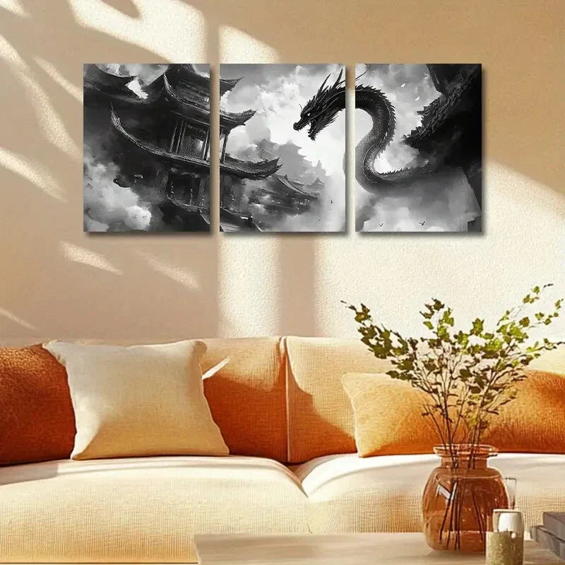 3pcs Chinese Dragon Design with Pagoda & Clouds Metal Print Ready to Hang Art