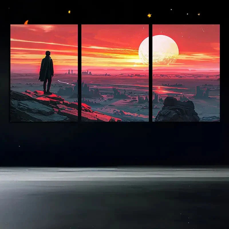 3pcs City of Ruins Sunset Man Standing Mountain Metal Print Ready to Hang Art