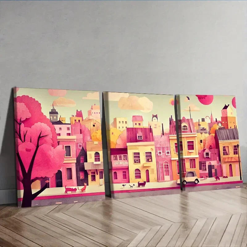 3pcs City with Cats and Dogs, Wall Art Set Canvas Framed 40x60cm - High Quality Print 100% Australian Made Wall Canvas Ready to Hang