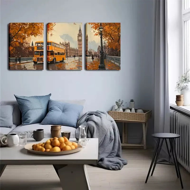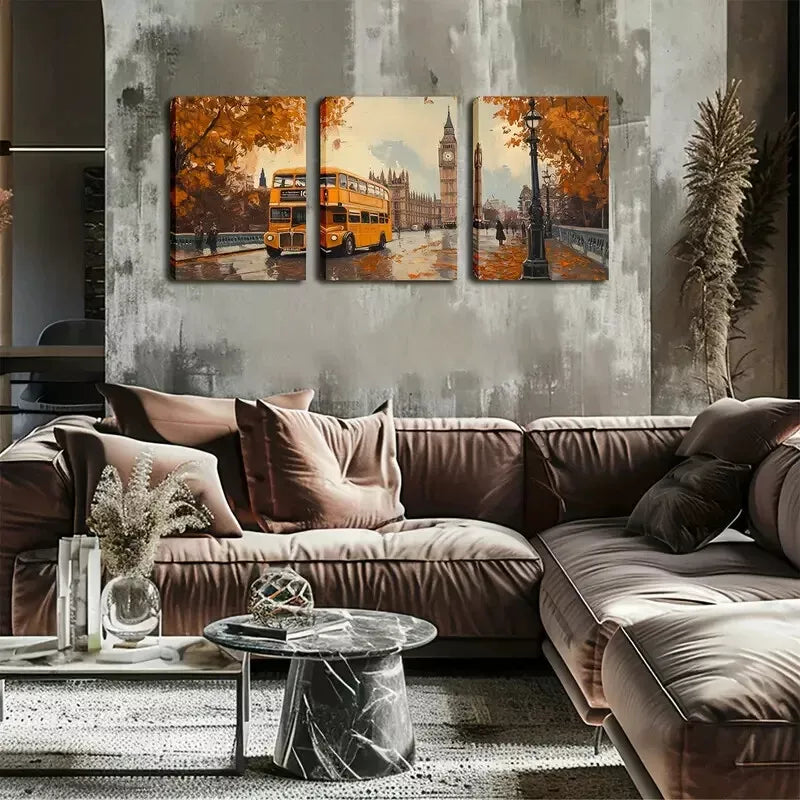 3pcs Cityscape with Yellow Double-Decker Buses Wall Art Set Canvas Framed 40x60cm - High Quality Print 100% Australian Made Wall Canvas Ready to Hang
