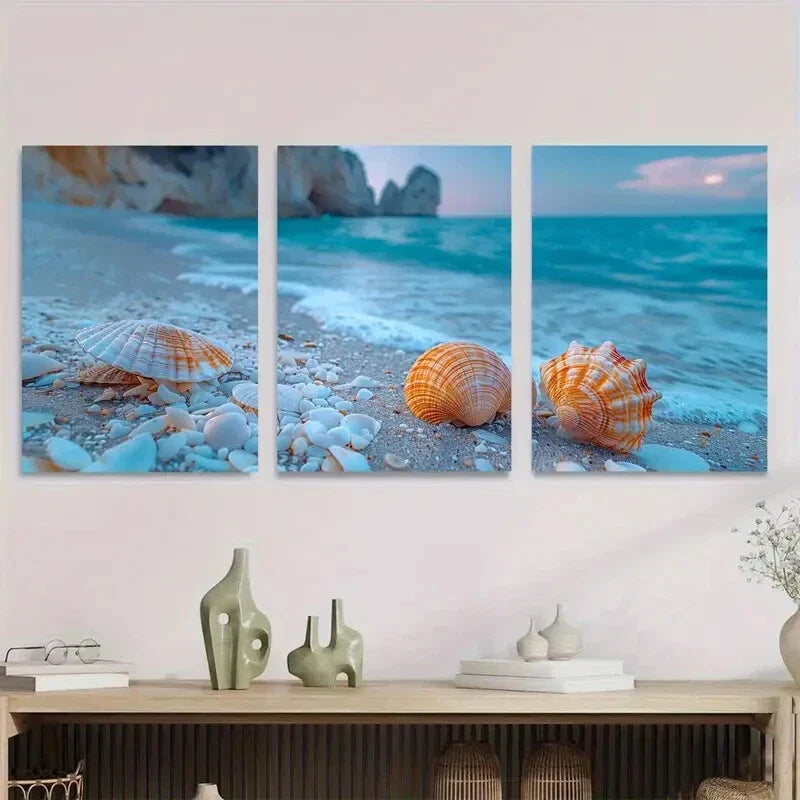 3pcs Coastal Sunset Seascape Beach Seashell Metal Print Ready to Hang Art
